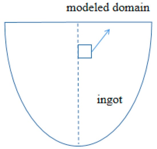 Dendritic growth and grain growth models were established using MICRESS 6.3 (ACCESS e.V. Aachen, Germany) software. The dendrite growth model had a mesh size of 600 × 600, a cell resolution of 0.1 μm, and a minimum time step of 1 × 10−3 s. The initial condition was considered to be 1 for the initial grain. The grain growth model had a grid size of 1000 × 1000, a cell resolution of 5 μm, and a minimum time step of 1 × 10−2 s. Figure 1 shows a schematic of the modeled domain, which was in the middle of ingot. Set 10 initial grain levels to randomly generate grains according to grain radius and distribution density.