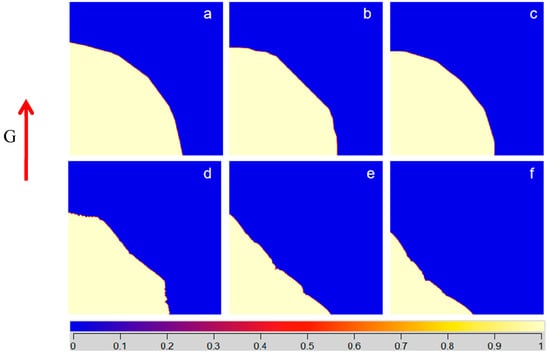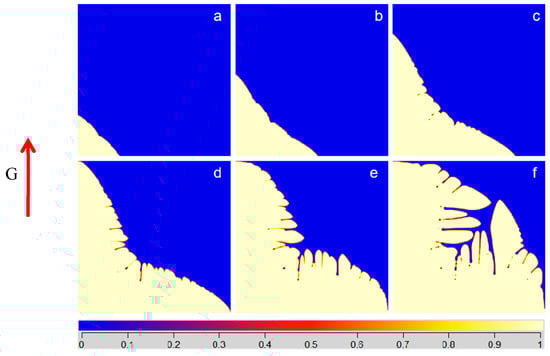 With the solidification layer moving inward, the heat dissipation ability of the solid phase was gradually weakened. The internal temperature gradient tended to be gentle. The solute atoms in the liquid phase were enriched, so the component supercooling in front of the interface increased. As the distribution coefficient of Al and V elements is close to that of Ti and their content is relatively low, the alloy is similar to pure metal if there is no Fe element in the alloy. Therefore, the component supercooling was not obvious and the grain was nearly plane growth, as shown in Figure 2a (the color bar represents the field parameters field parameters , and 0 and 1 represent the liquid phase and solid phase respectively). When the Fe content increased to 0.9 wt%, the component supercooled region at the front of the interface was larger. The protruding part continued to grow into the supercooled liquid phase. At the same time, branches grew on its side, and the grain growth tended to be dendrite. With the increase in Fe content, the growth rate of the whole grain decreased. In a certain concentration range, Fe content has a great influence on the morphology of Ti–6Al–4V grains. As shown in Figure 3, in the early stage of solidification, the grain surface was relatively stable. The solid surface formed a bulge and gradually extended with time to the supercooled zone. Due to the small temperature gradient (5 K/cm) of the suspension melting, equiaxed grains were finally formed.