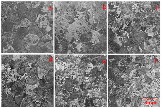 Figure 7 shows the grain size of the alloy obtained by levitation melting. In a certain range, with the increase in Fe content, the grain size of the alloy gradually decreases. According to the number of grains and the cut-off area, the average grain radius is simply estimated, as shown in Figure 8. Compared with the simulated grain size, the experimental result was larger, which is due to the limited simulation time, while the experimental grains completed the grain growth. When there was no Fe in the alloy, as shown in Figure 7a, the grain size was the largest and the grain distribution was relatively uniform. The grain radius was about 2.29 mm, and the shape of the grain was close to circular. With the increase in Fe content, the grain size of the alloy decreased gradually, while the overall decreasing trend was mitigated. When the Fe content was 0.9 wt%, the average grain radius was the smallest (about 1.03 mm).