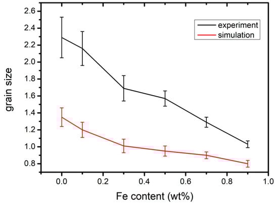 - With the increase of Fe content, the grain size of the alloy decreased gradually. When there was no Fe in the alloy, the grain size was the largest (radius close to 2.29 mm), the grains were more uniform, and the shape of the grain was close to circular. The grain size decreased gradually with an increase in the Fe content and the overall decrease trend slowed down. When the Fe content was 0.9, the average grain radius was the smallest, which was about 1.03 mm.