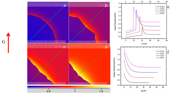 As shown in Figure 9, the Fe composition distribution along the green lines was obtained and demonstrated in Figure 9e. As the Fe content increased from Figure 9a–d, the maximum solute concentration CL* of Fe in the liquid phase at the solid–liquid boundary continued to rise (here represented by mass fraction), which were 0.67, 1.12, 1.48, and 1.63 wt%, respectively, corresponding to the four peaks in Figure 9e. The segregation ratio SR was 4.01, 4.15, 4.00, and 3.54, respectively, and the overall segregation trend was reduced. Within a certain range, the diffusion distance δn of Fe (Figure 9f) in the liquid phase had a linear relationship with the Fe content in the alloy, and the relationship can be fitted as: