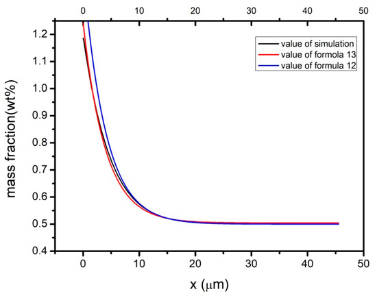 The composition of the liquid phase outside the solute enrichment layer is no longer C0, but gradually increases in the case of limited liquid volume due to convection in the outer diffusion layer during the actual solute redistribution process. As the actual CL* < C0/K0, the solute concentration calculated by Equation (13) is higher, as shown in Figure 10. In this work, since the solidification process of levitation melting was not directional solidification, the direction of the temperature gradient has little effect on the grain morphology. As shown in Figure 9, the grain growth speed was slow in the direction perpendicular to the larger plane of the grain, which had an angle of 45° with the relative temperature gradient direction. The solute distribution value should be between Equations (13) and (14). For the levitation melting of the Ti–6Al–4V–xFe alloy with a slow growth rate, the modified distribution equation of solute in the steady state can be proposed according to the results of phase field simulation: