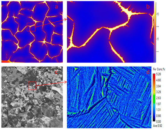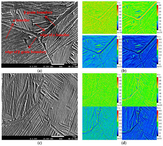 In the same way, V and Fe, as β stable elements, concentration increased from the inner area to the edges of α lamellae. Due to the wide β grain boundary, the segregation at the edge of the β grain boundary was more obvious. Since Fe is a stronger β stable element than V, the segregation of Fe was more obvious. Comparing the β grain boundaries in Figure 11a,c, Figure 11c was finer (about 1–2 μm), which may be attributed to the grain refinement of Fe. The distribution trend of Figure 11b was the same as in Figure 11d.