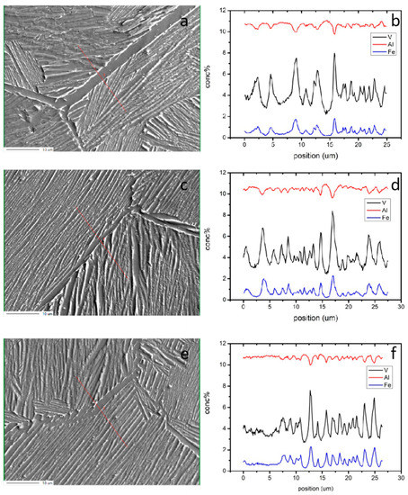 Results of the EPMA line scan. (a) Selected location of Ti–6Al–4V–0.5Fe, (b) Composition distribution of Ti–6Al–4V–0.5Fe, (c) Selected location of Ti–6Al–4V–0.7Fe, (d) Composition distribution of Ti–6Al–4V–0.7Fe, (e) Selected location of Ti–6Al–4V–0.9Fe, (f) Composition distribution of Ti–6Al–4V–0.9Fe.