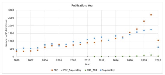 Literature search showing the number of publications on powder bed fusion (PBF), superalloys, PBF of superalloys, and PBF of Alloy 718.