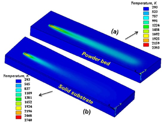 Temperature distribution of a single track that was melted on (a) a powder bed and (b) a solid substrate. Reproduced from [17], with permission of Elsevier.
