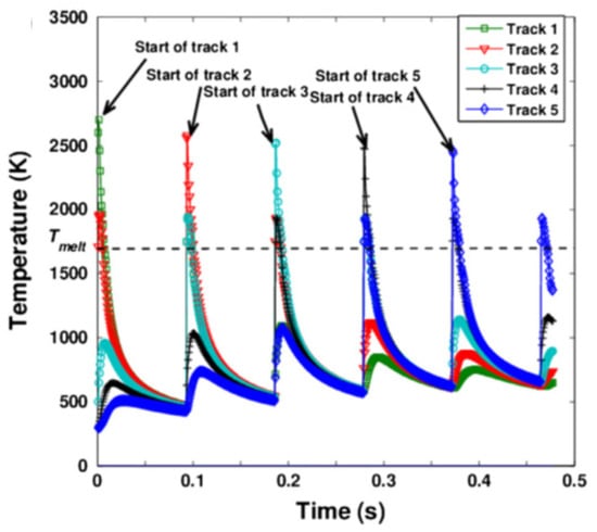 Temperature distribution of five single tracks positioned side-by-side during the sequential melting of each track. Reproduced from [17] with permission of Elsevier.