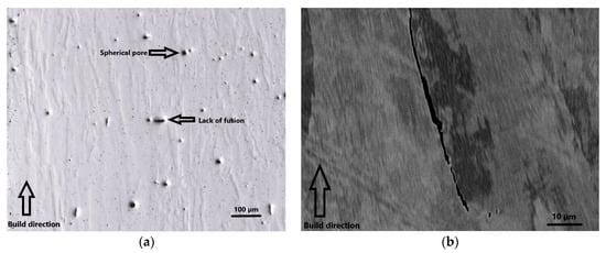 Laser powder bed fusion (L-PBF)-manufactured Alloy 247LC: (a) light microscopy (LM) image of lack-of-fusion and spherical pores; (b) SEM image of grain boundary crack.