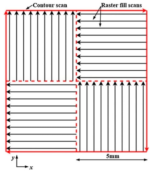 An island scanning strategy where the raster fill scans in each area are perpendicular to one another [36], used under CC BY 4.0.
