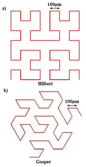 The Hilbert (a) and Gosper (b) fractal scanning strategies showing the patterns of the micrometer length scans [36], used under CC BY 4.0.