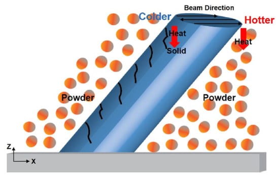 Schematic diagram of an electron beam powder bed fusion (EB-PBF) cylindrical specimen at an incline on the substrate. Heat is dissipated through the specimen on the left-hand side and the powder on the right-hand side. Consequently, colder and hotter regions are obtained on the left- and right-hand sides, respectively. Reproduced from [38], with permission of Springer Nature.