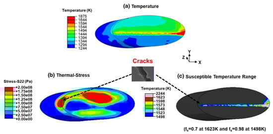 Distribution of (a) temperature, (b) thermal stress, and (c) critical temperature range (CTR) on the x-y plane in EB-PBF with Alloy 247. On the left side, the CTR is intercepted by high thermal stress, and the formation of hot cracks is predicted. Reproduced from [38], with permission of Springer Nature.