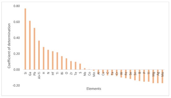The plot of the coefficient of determination () of various elements. The coefficient of determination was calculated from a linear regression that modeled the correlation of crack density with the concentration of each element. The plot shows that Si has the largest value which means that Si has the strongest correlation to crack density. Replotted from [49].