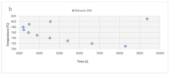 (a) Time-temperature-transformation (TTT) diagram of Alloy 247LC and Inconel 738LC, modeled in JMatPro, showing the precipitation of 0.5% γ′. Both alloys display fast precipitation kinetics; (b) TTT diagram of Nimonic 263, modeled in JMatPro, indicating slow precipitation of 0.5% γ′.