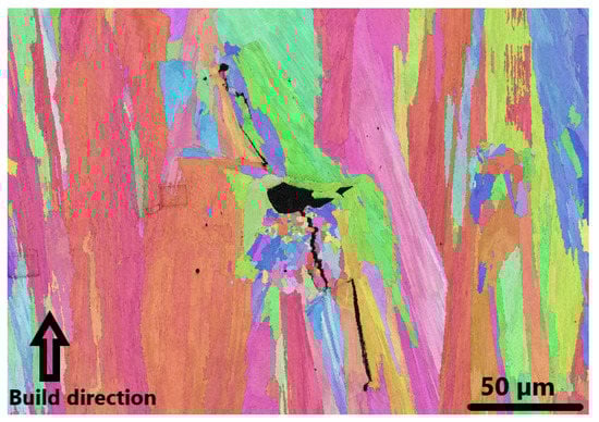 The role of oxides in causing cracks was investigated by Qiu et al. [82] with Al-, Si-, and W-based oxide particles that have high melting points. Qui et al. proposed that during L-PBF manufacturing of Inconel 738LC, the cause of cracking was less associated with the element and more associated with the melting point of the oxides, and high melting point oxides cause cracks. The findings revealed that large and elongated , discrete spherical oxides containing W and Si, and loosely bonded oxide clusters containing W and Si were around cracks that formed along grain boundaries [82]. Nanoindentation measurements were 8–9.5 GPa along these grain boundaries, but 2 GPa in the matrix. Qui et al. associated the high hardness at the grain boundaries with the presence of oxides and proposed that this caused grain boundary embrittlement. During solidification, oxides are the first to nucleate in the liquid, followed by γ. Solidification contraction and thermal shrinkage between the interface of oxide clusters and the γ precipitates cause cracks to form. Cracking may also occur along the centerline of the oxides or the embrittled grain boundary. Cracked grain boundaries were populated with small, sometimes equiaxed grains. Some cracks initiated from lack-of-fusion defects, probably due to higher concentrations of stress around the pores. Such cracks were found in L-PBF-manufactured Alloy 247LC investigated by the present authors. An exemplary electron backscatter diffraction (EBSD) micrograph that displays a crack initiated by a lack-of-fusion pore is shown in Figure 13. Small equiaxed grains between larger columnar grains are also seen in the figure.