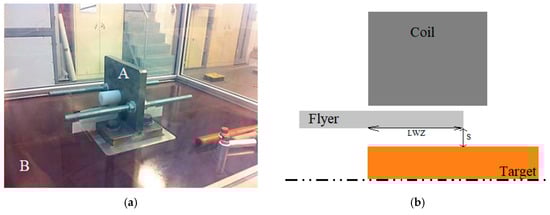 The setup applied for the performance of MPW in this study: (a) the coil assembly (A) on the station of the equipment, (b) the arrangement of coil-flyer-target (that were kept constant in this study).