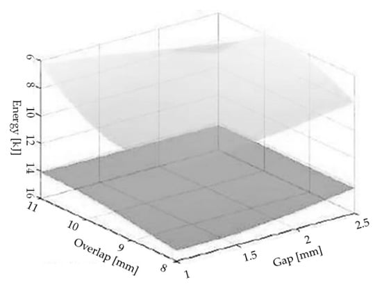 Figure 2 illustrates the welding window from which the welding parameters were selected for joining the aluminium tube to copper rod, as presented in Table 4. A welding window can give us an indication of the welding range, this window was obtained from the results of the compression tests of similar aluminium tubes and copper rods in a previous study [] taking into account the effect of three main parameters such as the charging voltage, the air gap width (S) and overlap distance (LWZ), this was possible to monitor these parameters during the MPW process. The experimental conditions that led to successful welds constitute the two planes shown in this window (Figure 2). However, the combination of different gaps and overlap distances will result in successful weld if the selected energy provides an appropriate impact velocity. Moreover, it should be noted that the welding window shape can change by the application of different input parameters, thus each experiment can have its own welding window depending on the values of energy, overlap distance (LWZ), and gap used for weld performance.