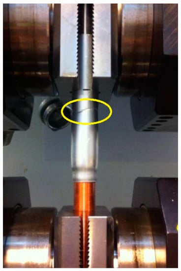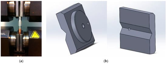 Regarding the mechanical properties of the welded experiments, a uniaxial tensile test was conducted by a machine illustrated in Figure 3a (Instron model 4507) using a strain rate of 2 mm/min. The parameters of the tensile tests were designed in accordance with ASTM A 370 as presented in Table 5. Moreover, it was necessary to prepare new grips for the stabilization of the cylindrical samples in order to perform the tensile test as illustrated in Figure 3. Since the tensile specimens have tubular sections, snug-fitting metal plugs were inserted far enough at the end of the tubes. This assembly was designed in accordance with the plug design mentioned in ASTM A 370 and applied to allow the jaws gripping the specimens properly. This assembly guaranteed sample holding without the tube walls being crushed. Moreover, the plugs did not extend into that part of the specimen where the elongation was measured.
