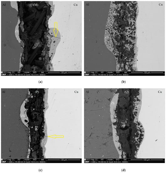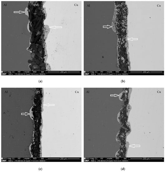 Regarding the formation of metallurgical bonds at the joint interfaces, as a guarantee for bonding, Figure 4 provides some information about the microstructure of the joint interfaces. The MPW is considered as a solid-state welding process, but the contrasts illustrated in these images confirm the presence of phases which have different atomic contrast from the Al and Cu base materials (indicated by white arrows in the images illustrated in Figure 4a–d). Moreover, a wavy pattern has formed on interfaces of these joints. Table 6 presents the average thickness values of these layers which are seen in these microstructures (Al/Cu-M, G, P, and Q joints as illustrated in Figure 4). This means that diffusion or melting has occurred on the surfaces of these flyers and targets during welding. However, the bonding time is so short in MPW that the hypothesis of diffusion is not achievable, therefore melting is confirmed. The supplied energy in conjunction with these four surfaces (M, G, P, and Q) generated jet and locally heated surfaces sufficiently to melt Al and/or Cu base materials in tiny zones by which they reacted and then solidified [,]. Moreover, these interfaces (Figure 4a–d) also consist of dark intermediate layers between the reacted zones which seem that the Al/Cu-G, and Al/Cu-Q joints contain the smallest layers. This intermediate layer is composed of oxide particles that mean that the jet formation has not been strong enough to reject these compounds out of the mating surface; this also indicates that the welding windows have not been adequate for the geometries used in this study. Moreover, it appears that the latter interface comprises porous reacted zones. These microscopic observations also revealed that the reaction zones formed at the copper base material appear almost continuous at the copper side and the thinnest layer has formed in the sandblasted specimen. However, some pocket-like zones have formed on the aluminium base.