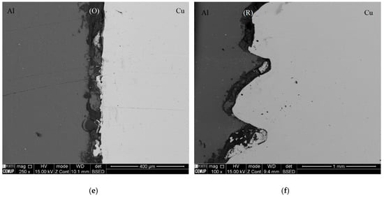 SEM/BSE images from the (a) Al/Cu-M, (b) Al/Cu-G, (c) Al/Cu-P, (d) Al/Cu-Q, (e) Al/Cu-O, and (f) Al/Cu-R joints produced by MPW technique.