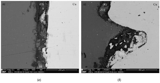SEM/BSE images used for the chemical analysis of the interested zones at the interfaces of the (a) Al/Cu-M, (b) Al/Cu-G, (c) Al/Cu-P, (d) Al/Cu-Q, (e) Al/Cu-O, and (f) Al/Cu-R joints produced by MPW technique.