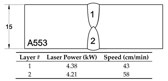 The laser welding conditions used were a 2-pass welding condition and optimized welding conditions with a penetration depth of 8 mm and 7 mm from [1] as shown in Figure 1.