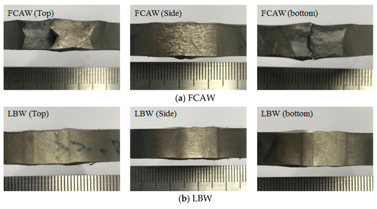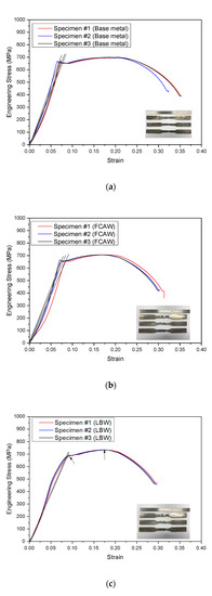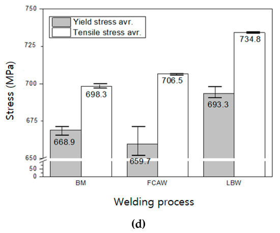 Figure 6a–c show the stress–strain curves by the welding process. Figure 6d shows the average values of each yield/tensile strength. In the results for (a), the yield strength and tensile strength of the base material were 668.9 MPa and 698.3 MPa. In the results for (b), the yield strength and tensile strength of the FCAW weldment were 659.7 MPa and 706.5 MPa. As the yield strength of the filler material was lower than the yield strength of the base material, it can be confirmed that the yield strength of the FCAW was slightly lower than the yield strength of the base material. In the results for (c), the yield strength and tensile strength of the LBW weldment were 693.3 MPa and 734.8 MPa. In the case of LBW, as no filler material was used, it can be confirmed that the value was higher than the yield strength and tensile strength of the base material.
