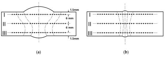 Measurement points of hardness test. (a) FCAW; (b) LBW.