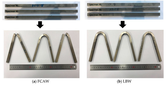 The bending test of the weld was carried out to confirm whether there was a harmful defect in the weld metal or whether it had sufficient ductility to the extent of the base metal. The common bending test used in this study is KS B 0804, which uses a U-jig called a 3-points bending test. The orientation of the specimen was made by bending the top, bottom, and side. The bending test of the butt weldment was based on the test method of KS B 0804. The bend test of the welded specimen and the results are shown in Figure 9.