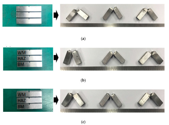 Prepared impact test specimens and tested specimens. (a) BM (Base metal). (b) FCAW. (c) LBW.