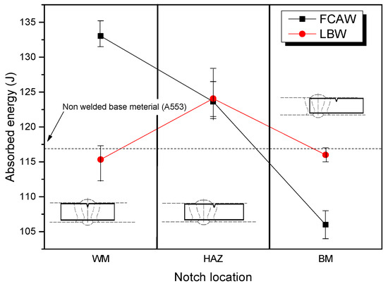 The impact-absorbed energy of the non-welded parent material was 117 J and is indicated by the dotted line in Figure 12. As mentioned above, the impact-absorbed energy of cryogenic steel was allowed to be 27 J in ASTM, which is a value that satisfies the standard. In addition, it meets the minimum impact-absorbed energy of cryogenic steel specified by IACS. The square dots represent the impact-absorbed energy of the LBW and the circle dots represent the impact-absorbed energy of the FCAW in Figure 12. The small horizontal bar shows the maximum and minimum shock absorption during three measurements, and the impact-absorbed energy of LBW was measured to be similar to the impact-absorbed energy of the base material. The impact-absorbed energy of the FCAW was measured by weld metal (WM) > HAZ > base metal (BM). The weld zone of the FCAW was a result of improved impact toughness of the weld zone due to the characteristics of the filler metal (containing 70% nickel). However, the impact-adsorbed energy of the base material (20 mm away from the weld zone) of the FCAW was 106 J, which is 10 J less than the impact-absorbed energy of the non-welded base material. It is not affected by the HAZ, but it can be predicted that the weld zone was softened because the heat temperature of less than 400 °C was applied to the base material.