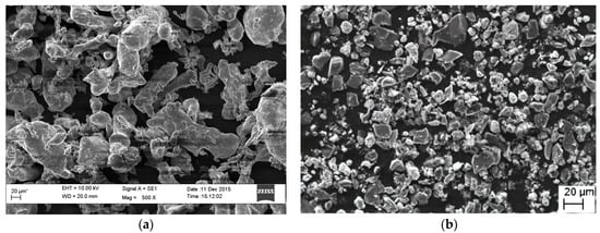 Morphology of the as-received powders. (a) Al 6061, (b) TiB2.