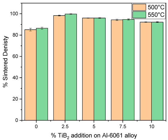 Figure 2 lists the sintered density of Al-TiB2 composites at 500 °C and 550 °C. As the concentration of TiB2 in the Al-6061 matrix is increased, the sintered density also increases, and it is highest in 2.5% TiB2 composite. The sintered density of the Al-6061 alloy was observed to be 85.12% at 500 °C, which increased up to 98.36% with 2.5% TiB2 addition. Further increase in TiB2 concentration up to 10% reduced the density to 92.2%. At 550 °C, a similar trend was observed with an increase in sintered density at 2.5% (99.81%), then decreased (92.2%) at 10% of TiB2. The presence of TiB2 particles restricts the expansion of pre-alloyed powder as the sintering takes place at solid-state conditions with a faster heating rate. As a result, the composites with a higher TiB2 content had the least expansion in the initial stage of sintering, and later densification occurred due to a faster heating rate and the load displaced on the punch. A total of 2.5% TiB2 powder in the Al matrix increased the density, but above 2.5%, TiB2 sintered density was gradually decreased. The reason is that at 2.5%, TiB2 concentration of reinforcement in the matrix uniformly distributed, but as the TiB2 increased in the matrix, the reinforcement was not evenly distributed, and TiB2 agglomeration and voids formed in the matrix. Increasing the sintering temperature from 500 °C to 550 °C with a fixed amount of TiB2 improved the sintered density slightly with correspondingly lowering the porosity. This is due to the benefits of elevated temperature on diffusion rate, sinterability, and matrix reinforcement bonding [17,29,30,31].