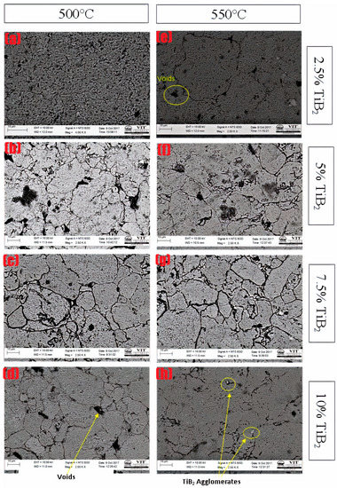 SEM micrographs of the Al-TiB2 compositions sintered at 500 °C and 550 °C are shown in Figure 3. From the micrographs, it was observed that temperature difference was showing the difference in the microstructure. The 500 °C sintered composite microstructures with a high area of light phase appeared when compared with the 550 °C sintered compacts, where the reason was that the temperature was not sufficient for the aluminum to fully pack around the TiB2 particles. As the TiB2 content increased in the matrix, TiB2 particles restrict the Al-Al contacts and as a result, Al penetration in between the TiB2 particles is restricted, which leads to the formation of the pores and slight reduction in the sintered density. Agglomerations (light phase) and porosity (dark phase) are crucial micro-structural characteristics that can be observed in the SEM images [32]. This agglomeration might be the outcome of the localized distribution of powders, while blending due to the non-identical size and density of TiB2 and Al-6061 [33]. It was observed from the micrographs that the aggregates of TiB2 particles were dispersed in the aluminum matrix at grain boundaries forming clusters around the grain. An increase in TiB2 content caused a decrease in uniformity and homogeneity [34]. This ultimately resulted in increasing agglomerations with an increase in the TiB2 concentration in the Al-6061 composite. Porosity was decreased while the uniformity was increased by increasing the temperature from 500 °C to 550 °C due to an increase in sintered density. Compared with other (Mahesh Paidpilli [35], V. Jaya Prasad [36], Z.Sadeghian [20]) Al-TiB2 composite microstructures, TiB2 particles were not clearly visible in the current work microstructures.