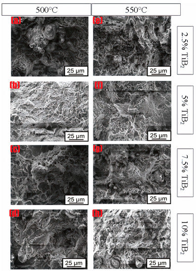 SEM Fractographs of Al-6061 at 500 °C: (a) 2.5% TiB2, (b) 5% TiB2, (c) 7.5% TiB2, (d) 10%TiB2; at 550 °C: (e) 2.5% TiB2, (f) 5% TiB2, (g) 7.5% TiB2, (h) 10% TiB2.