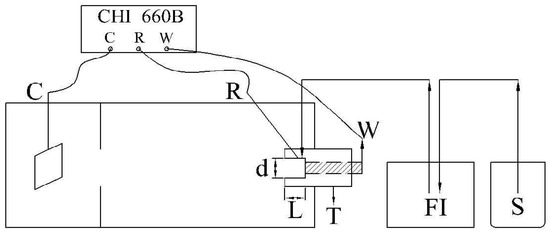 Schema of the experimental setup with the flow injection and the partially-closed electrode; S—injection solution; FI—flow injection; W—working electrode (iron or nickel, d = 2 mm); R—reference electrode (SCE); C—counter-electrode (Pt sheet); T—PMMA tube for the partially-closed electrode (PCE, in which L = 4 mm and d = 4 mm).