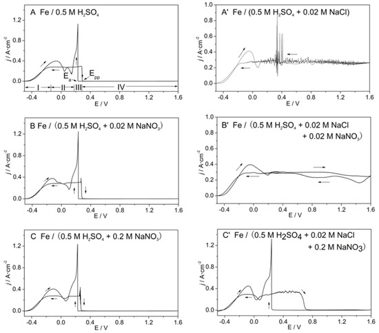 The cyclic voltammetry curves of the iron electrodes at dE/dt = 10 mV/s in various solutions (A) 0.5 M H2SO4; (A’) 0.5 M H2SO4 + 0.02 M NaCl; (B) 0.5 M H2SO4 + 0.02 M NaNO3; (B’) 0.5 M H2SO4 + 0.02 M NaCl + 0.02 M NaNO3; (C) 0.5 M H2SO4 + 0.2 M NaNO3; (C’) 0.5 M H2SO4 + 0.02 M NaCl + 0.2 M NaNO3.