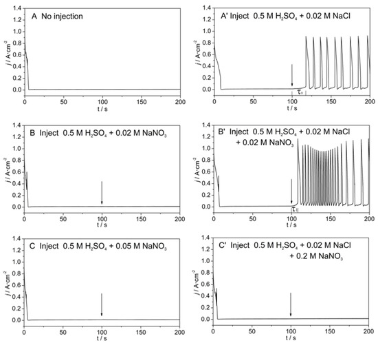 Figure 3 shows the effects of NO3− ions and/or Cl− ions on the j–t curves at E = 0.275 V. The current was low and stable (Figure 3A) for the passive film on the surface which was dense before the perturbation. As shown in Figure 3B,C, when the injected solutions contained different concentrations of NO3− ions, the current did not change significantly after the injection, indicating the passive films are not destroyed by NO3− ions [29]. However, if there were only Cl− ions in the injected solutions, the current oscillations appeared after a period of induction time, τ0 (Figure 3A’), which means that the passive film was destroyed by Cl− ions; thus, pitting was induced [28]. When the injected solutions contained both NO3− ions and Cl− ions, the experimental results changed with the ratio of CNO3−/CCl−. If CNO3−/CCl− = 1:1, the current oscillations appeared as before (Figure 3B’), but the oscillatory frequency increased, and the induction time reduced (τ1 < τ0) obviously, suggesting that NO3− ions at low concentration assists Cl− ions to destroy the passive film. If CNO3−/CCl− = 10:1, no oscillation was observed, and the electrode remained passive after the injection (Figure 3C’), indicating that NO3− ions at high concentrations suppress the aggressive action of Cl− ions.