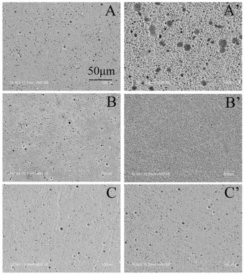 Figure 4 exhibits the surface morphologies of electrodes after the potentiostatic polarization. As shown in Figure 4A, relative uniform corrosion morphology was seen without perturbation. Additionally, no visible change of surface morphology was observed when the Cl− free solutions were injected into the vicinity of PCE (Figure 4B,C). If the injected solution only contained Cl− ions, obvious pits appeared (Figure 4A’). However, in the presence of NO3− ions in the Cl−-containing injections, the corrosion behavior was quite different (Figure 4B’,C’). If the ratio of CNO3−/CCl− was 1:1, the pits with small radii were numerous and generally distributed (Figure 4B’). Both SEM and the integral quantity results (Table 2) prove that there are synergistic effects between Cl− ions and NO3− ions when the ratio is 1:1. When the concentration of NO3− ions was high (Figure 4C’), the surface morphology was similar to that without injection (Figure 4A) or after the perturbation by Cl−-free solutions (Figure 4B,C). So, the chloride pitting was inhibited by NO3− ions when its concentration was high.