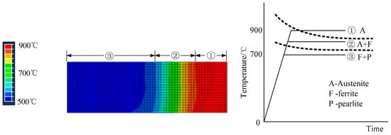 In this paper, differential heat treatment of the blank prior to forming is used to prepare hot-stamped parts with tailored properties. Like traditional hot stamping, tailored hot stamping consists of heating, transferring, forming and cooling. The concept of the selective heating strategy is to adjust the local mechanical properties by means of austenite transformation control in the heating step of the hot-stamping process []. The mechanism of the strategy is illustrated in Figure 1. In the differential heat treatment of a boron steel blank, there are three phase regions: the full austenite region, the transition region and the initial phase region []. The hard zone is heated to the austenite temperature range and is fully austenitized by heat preservation, whereas the soft zone is heated to the middle temperature, retaining its initial phase of boron steel, while partial austenitization occurs in the transition zone at a critical temperature. After full quenching, martensitic transformation occurs in the high-temperature region, resulting in a hard region with high strength, and the initial phase remains in the middle temperature range, resulting in a soft region with high plasticity. The transition zone is mainly composed of martensite, retained austenite and initial phase. The length and microstructure distribution of the transition zone depend on the temperature gradient heated on both sides.