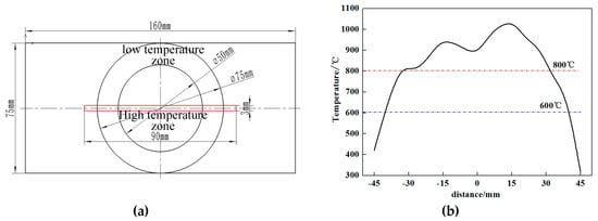 Temperature distribution of sheet after selective heating. (a) Top view: the red rectangle is the axial temperature measurement area. This area is taken as a microstructure characterization sample; (b) central axis: temperature is measured along horizontal axis.