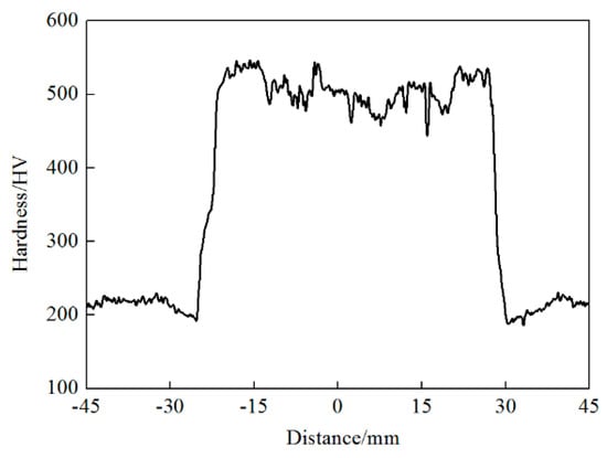 Hardness testing and metallographic testing were conducted to assess the microstructure distribution and load-bearing performance, respectively. This was performed by cutting a beam 90 mm long and 3 mm wide symmetrically along the horizontal axis. The sampling location is shown in the red area of Figure 4a. The hardness was measured every 0.2 mm along the axis by a microhardness tester. In Figure 5, Vickers hardness values are plotted on a length scale, where the bar mid-length is taken as the origin. The results show that the hardness is high in the middle of the specimen and the value of the high-strength zone is from 440 HV to 550 HV, and the length is from −21.66 to 27.89 mm, which is consistent with the heating range of the high-temperature zone. The high-temperature zone is fully austenitized in preheating and martensitic transformation occurs after quenching. The hardness fluctuation corresponds to the winding of the induction coil, which indicates that the faster the heating speed, the higher the hardness of the martensite. The ranges of the hardness value decrease rapidly in the transition zone, located from 3.73 mm on the left and 2.61 mm on the right, which has a graded multiphase microstructure. Away from the hot zone, the hardness of the low-hardness zone at both sides is 178–230 HV, and the hardness of the initial phase after heating is slightly higher than before. According to the hardness distribution, the sample shows a gradual structure gradient, which can be divided into three zones: the hard zone, the transition zone and the soft zone. The microstructure of each zone, observed by optical microscopy, is shown in Figure 6. The soft zone is the initial phase, with about 200 HV, which is the mixed structure of ferrite and pearlite. According to the calculation of the intercept method, the grain size is about 10 μm. The hard zone is martensite with a hardness above 440 HV, which is a large number of fine laths of about 0.15 μm. Figure 6c,d show the microstructure of the transition zone with different hardness. The transition zone is composed of ferrite, residual austenite and martensite, an irregular crystal morphology. With the increase of martensite, the hardness increases gradually.