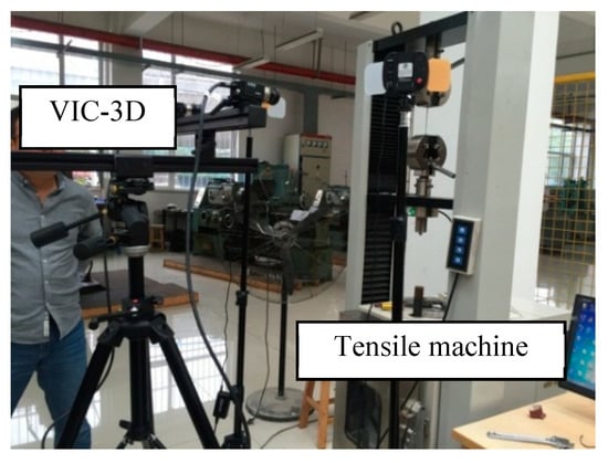 In this study, a non-contact full field strain testing system was used to evaluate the properties of the hot-stamped parts with tailored properties by zones based on DIC technology and the tensile testing machine, as shown in Figure 7. The non-contact full field strain testing system is mainly composed of hardware part and software part. The hardware part includes two charge coupled device (CCD) cameras (GS3-U3-51S5M, Point Grey, Richmond, BC, Canada) pan tilt, light source and computer, and the software part is VIC-3D by Correlated Solution company in the United States, composed of image acquisition system and data analysis and processing system. It is a powerful system for measuring and visualizing of shape, displacement and strain, movements and vibrations of surfaces in three dimensions. Firstly, a sample taken along the length direction of the hot-stamping parts with tailored properties was randomly speckle treated, as shown in Figure 8, and the microstructure of the tensile samples showed a symmetrical distribution of initial phase, multiphase and martensite. Before the experiment started, it was necessary to calibrate the whole field strain measurement system to improve the measurement quality. Two CCD cameras were set up at an angle between 15° and 60° to ensure that the specimen is full in the whole field of vision with reasonable tensile allowance. Speckle quality assessment function was used to focus the camera and adjust the brightness and exposure time, and then selected the appropriate correction plate through the calibration images function to make sure the size of the correction plate should be about 80% of the camera’s view. About 25 photos of the calibration plate and the specimen in different relative positions were taken as image correction samples, through VIC-3D software (CSI, VIC-3D 7), the calibration results are analyzed and processed, and the red error reported pictures are deleted to ensure that there are no less than 15 valid pictures. If the system scores pass, the calibration is successful. Otherwise, this step needs to be repeated until the calibration is qualified. After the above steps were completed, the tensile test was carried out on the tensile testing machine at the strain rate of 0.1 s−1 until the specimen is broken, and 192 speckle images were collected in the whole process. The images were imported into the data analysis and processing software. Taking the initial state as a reference image, the analysis area of 80 mm was selected. In the DIC analyses, and the following parameters were used: grid size, 45–45 pixels; and grid overlapping, 8 pixels. And the normal strain, shear strain and other information are obtained by software calculation. The characteristics of strain in different micro regions were analyzed with an scanning electron microscope (SEM), based on the EBSD technique. The samples for EBSD were cut from before and after deformation of the workpiece and were prepared by mechanical polishing, followed by electropolishing, to remove the deformed layer on the surface that formed during the mechanical polishing. The EBSD scans of 60 × 60 m, with a step size of 0.06 µm, were performed in an SEM system operated at 20 kV. The post-processing of the scanned data was carried out using TSL OIM software (EDAX, 7.3.0 × 86).