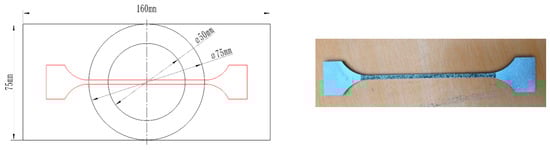 The material used in this paper was cold-rolled 22MnB5 boron steel with a thickness of 1.4 mm provided by Maanshan Iron and Steel Group Co., Ltd. The initial microstructure contained a mixture of ferrite and pearlite. The chemical composition of the investigated steel is listed in Table 1. A 75 mm × 160 mm rectangular boron steel plate was partly induction heated above 900 °C by induction heating using an experimental device with an oscillating power of 15 kV and a 50-mm-diameter induction coil. The distance was 6 mm from the induction coil to the sheet. The induction heating experimental device is shown in Figure 2. Figure 3 shows the measurement results of the non-uniform temperature field of the induction heated specimen by infrared thermal imaging. It can be seen that, due to the edge effect, the plate specimen is heated from the outer ring along the winding direction of the coil. The temperature rises rapidly and the plate specimen presents an obvious temperature gradient along the diameter direction of the circle. The experimental results show that the non-uniform temperature field of the boron steel plate can be established by induction heating, and the average heating rate is 68–88 °C/s. The central temperature of the plate can reach the Curie temperature in 8–10 s, and the maximum heating rate can reach 200 °C/s. The high-temperature zone (austenite phase) of Φ 50 mm and the annular low-temperature zone (original initial phase) with an inner diameter of Φ 50 mm and an outer diameter of Φ 75 mm, were obtained experimentally. The temperature distribution of the plate specimen is shown in Figure 4.