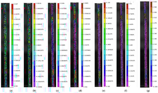 Cloud map of full-field equivalent strain change with time in tensile test: (a) Step 40; (b) Step 60; (c) Step 90; (d) Step 120; (e) Step 150; (f) Step 190; (g) Step 192.