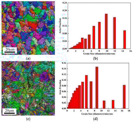 Electron backscattered diffraction (EBSD) analysis of a hot-stamped part with tailored properties. (a) Inverse pole figure (IPF) and image quality (IQ) diagram of initial phase zone; (b) grain size distribution of initial phase zone; (c) IPF and IQ diagram of martensite phase zone; (d) grain size distribution of martensite phase zone.