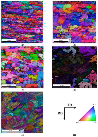 IPF + IQ diagram of a hot-stamped part with tailored properties with different deformation ratios after a tensile test; (a) ε = 0.607; (b) ε = 0.04; (c) ε = 0.0064; (d) ε = 0.0048; (e) ε = 0.0039; (f) different colors represent different orientations: blue represents the orientation of {111}; red represents the orientation of {001}; green represents the orientation of {101}.