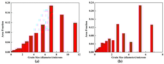 Statistical distribution of grain size in different deformation ratios; (a) ε = 0.607; (b) ε = 0.04.