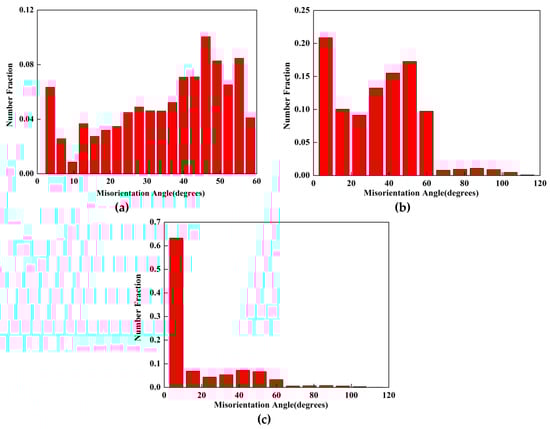 Figure 14 and Figure 15 show the misorientation distribution of the grain boundaries before and after deformation in the initial phase zone and the martensite zone, respectively. It can be seen from Figure 14 that before deformation, most of the grain boundaries are high-angle grain boundaries, i.e., more than 15°, and low-angle grain boundaries account for only 13.5%. The increase of deformation causes the number of low-angle grain boundaries to increase continuously, which is a result of the increase in dislocation density. When the deformation ratio increases from 4% (Figure 14b) to 60% (Figure 14c), the low-angle grain boundary percentage increases from 20.9% up to 63.3%. Martensite with multi-scale characteristics has a high dislocation density, as shown in Figure 15. Before the tensile test, the low-angle grain boundaries accounted for 27.5%. The misorientation of grain boundaries was almost unchanged after tensile test, which indicates that there was no micro-strain in the martensite phase zone during the uniaxial tension process.