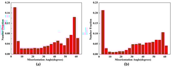 Misorientation distribution of grain boundaries in the martensite phase zone; (a) before tensile test; (b) after tensile test.